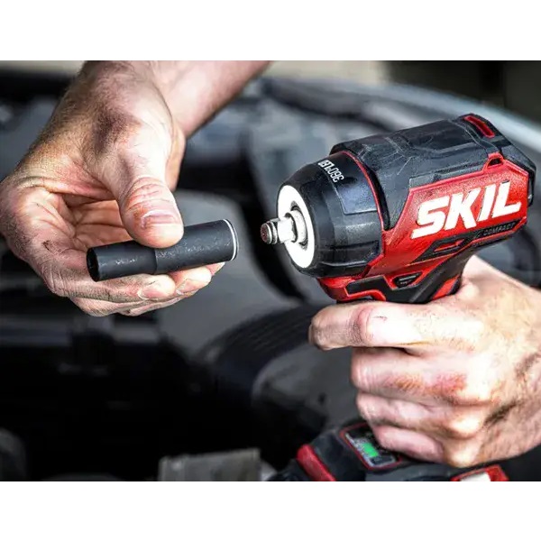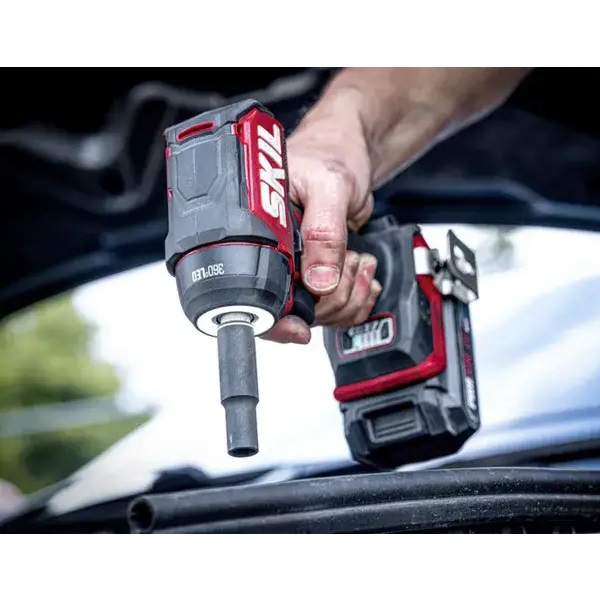 Powerful rechargeable 3/8" Wrench with 1/2" drive adapter with 20V Brushless Motor, Maximum tightening torque 250Nm, Equipped with powerful 360° front lighting, Has a light and compact structure – very comfortable to work with, Weighs only 1.3 kg (without battery), Comes with 2.0Ah Battery + SKIL Charger.