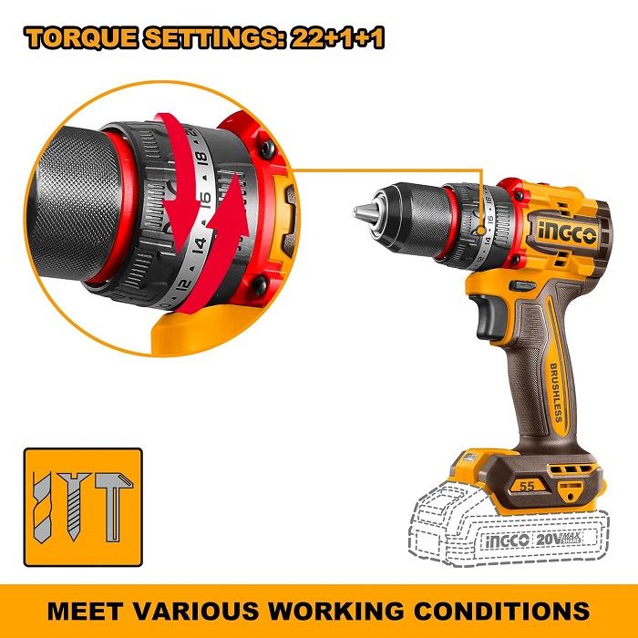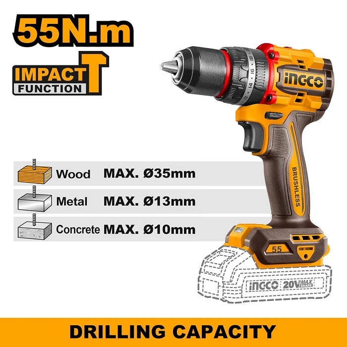 PROFESSIONAL POWER-20V brushless motor delivers 55Nm Max Torque, 0-2000 RPM torque and 30,000 BPM for fast drilling and driving in wood, metal, and masonry. 30% more efficient than brushed motors with longer runtime. (TOOL ONLY)