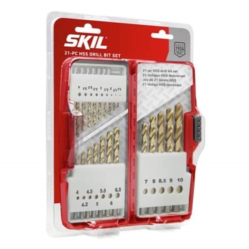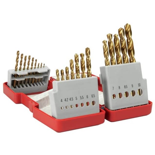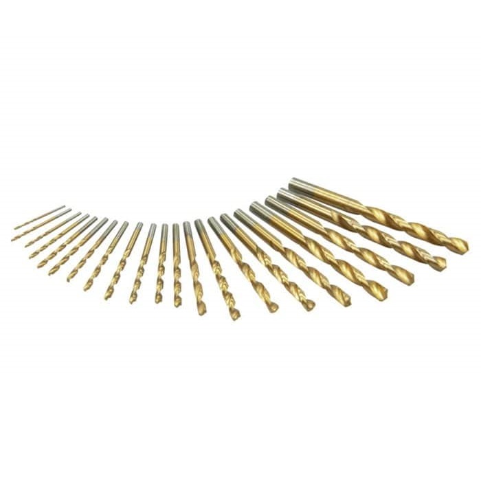 Set of 21 titanium-coated HSS drill bits in a clear hard case.