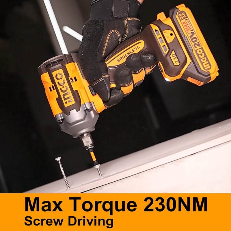 Ingco 2in1, Brushless Impact Wrench and Impact Driver, 230NM, 3 Variable Speed, 1/2", Hex shank: 6.35mm, No-load speed: 2000/2400/2600rpm, Impact rate: 2100/2500/2900bpm, Max torque: 230Nm, Integrated LED work light, making it versatile for tasks like furniture assembly, bicycle assembly, and DIY projects, Comes with 2 2Ah Batteries, Charger, 3 sockets(17,19,21mm) and Carying Case.