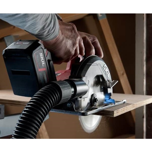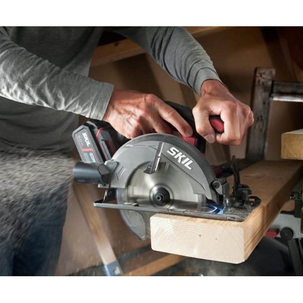 165mm (6.5") Professional 20V Brushless Circular Saw, capable of making cuts to a depth of 61 mm at 90°, Equipped with LED lighting that illuminates the cutting line, dust-proof bearings for maximum durability, and a connection to a vacuum cleaner, Has an ergonomic design that allows easy and safe work, Electric brake for quick stopping, Comes with 2.0Ah Battery + SKIL Charger.
